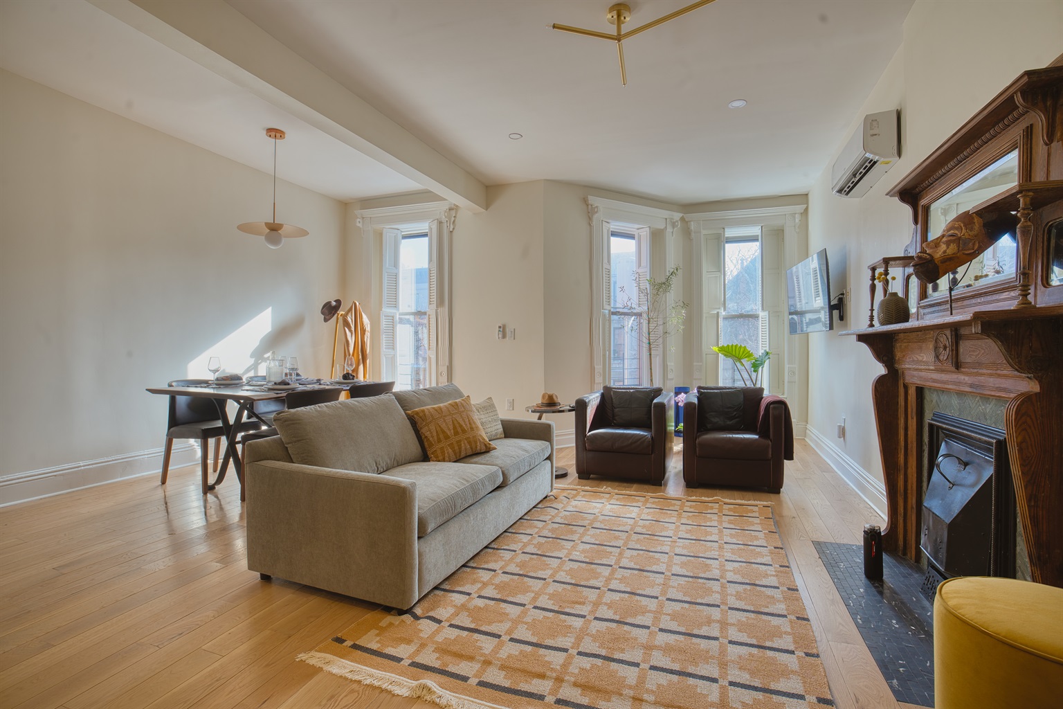 3 Bedrooms • 3 Bathrooms 3 Baths • Sleeps 2-6Your private 1,700 sq ft upper duplex on one of the most beautiful brownstone blocks in all of Brooklyn — literally one door from the official Stuyvesant Heights Historic District.This is the entire top two floors of a restored townhouse: two full private floors connected by your own grand staircase (no one above you). It feels exactly like having your own private Brooklyn townhouse, but with brand-new hotel-level finishes.